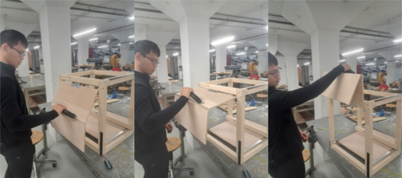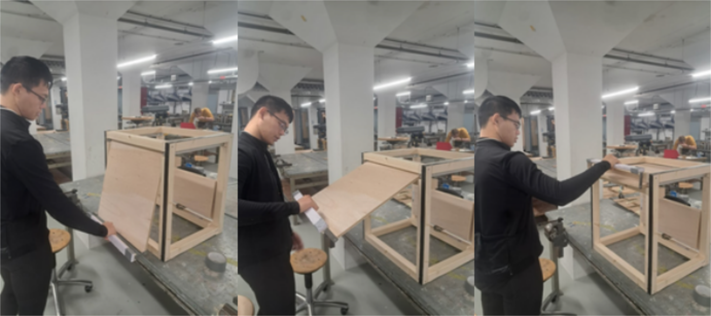Rails, spring loaded hinges, tension cables and rotation axles allowed us to make a prototype of the door.