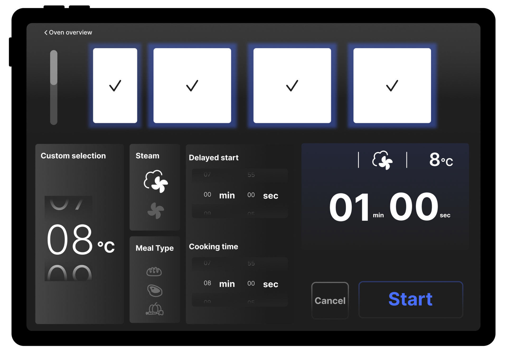 To capitalise on existing tablets aboard each aircraft we've developed an interface which allows controlling individual, grouped or all ovens at once. Reducing stress and increasing speed, oversight and efficiency for flight attendants.