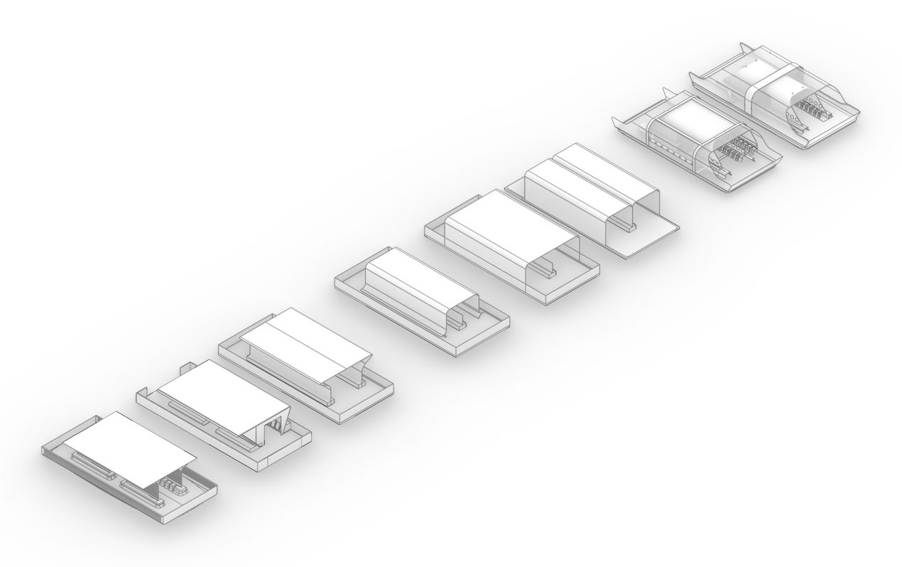 To guarantee comfort we've identified the need for some technology to be able to create such experiences. The ceiling is a high tech component, still ultra simple but it creates the safe space for passengers and a reason to use the ferry on cold, stormy or super warm summer days.