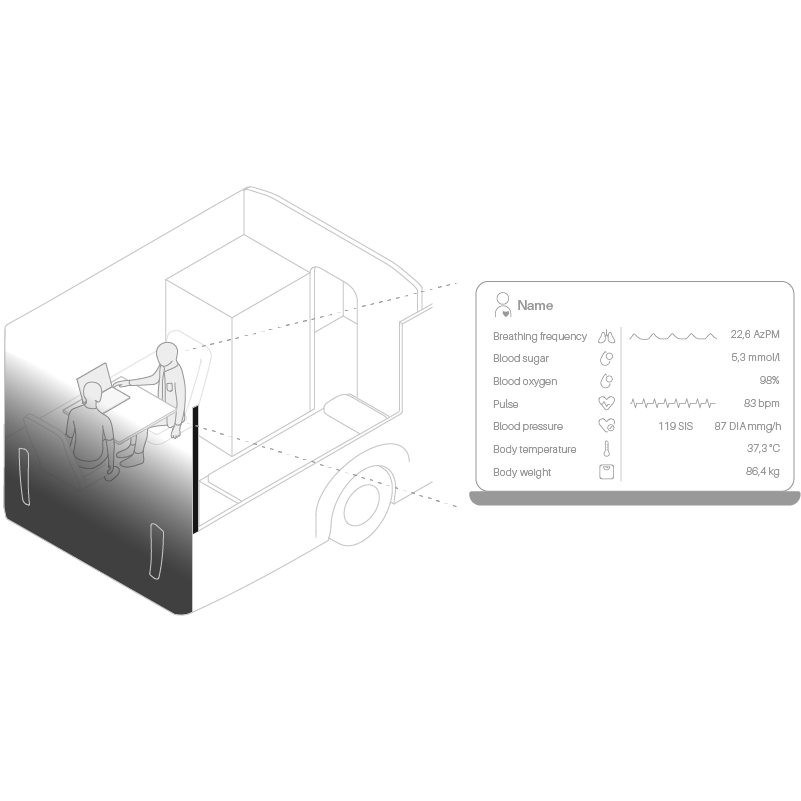 Vitalvision is a securely installed measurement station designed for mobile medical contexts. The station simultaneously captures relevant vital parameters. The mobile health station is currently used by the DB to reach remote cities and serves as a quick reaction force to provide urgent healthcare needs.